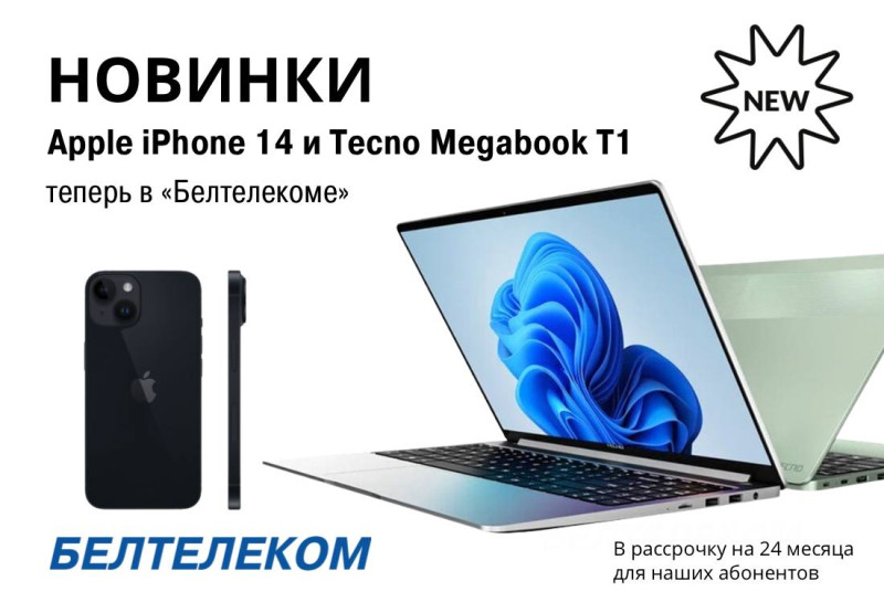 В сервисных центрах компании "Белтелеком" в продаже появились смартфон Apple iРhone 14 и ноутбук Tecno Megabook T1.