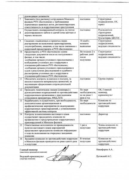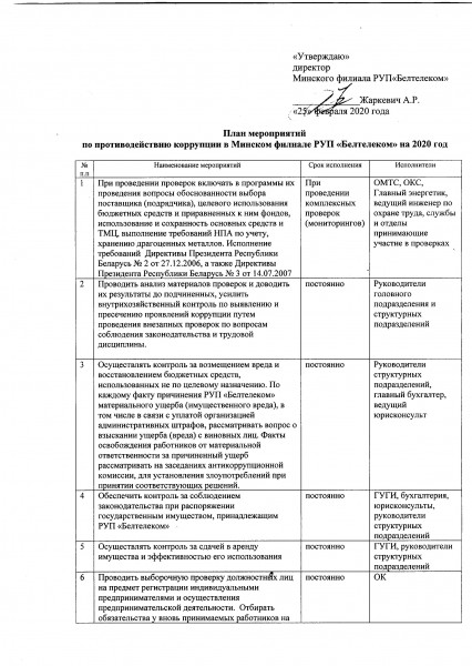 План мероприятий по противодействию коррупции в Минском филиале РУП "Белтелеком" на 2020 год