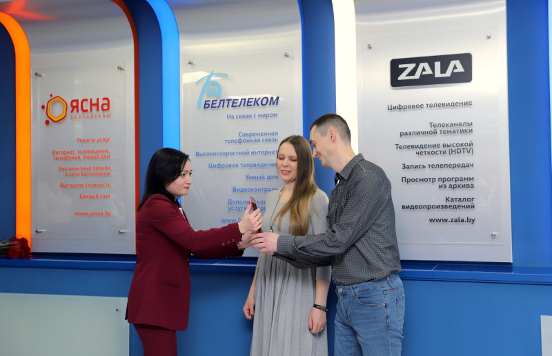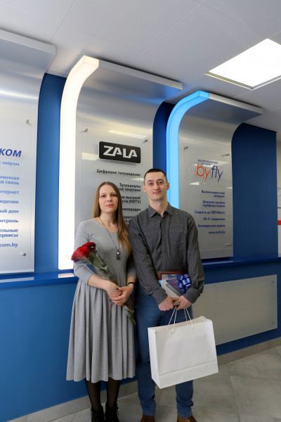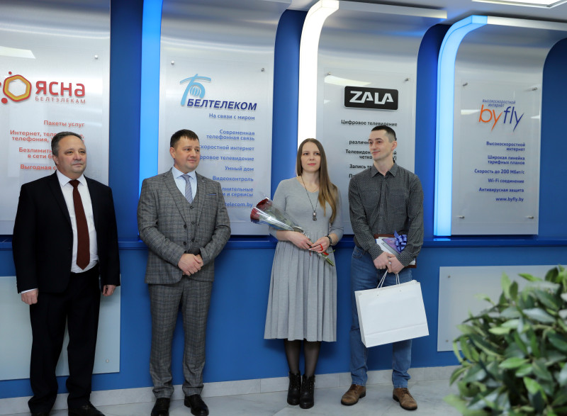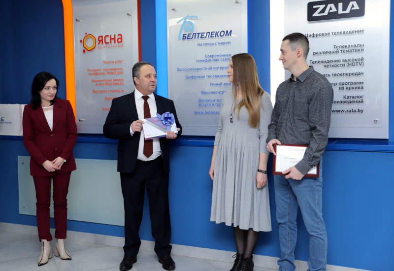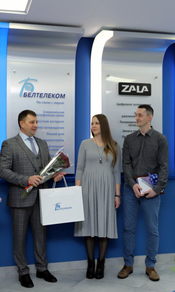 Дмитрия с супругой Натальей приветствовали заместитель директора по техническим вопросам Минского филиала РУП «Белтелеком» Андрей Никифоров и начальник управления организации продаж Елена Слабко. В торжественной обстановке Дмитрию вручили сертификат Почетного абонента и подарок от компании «Белтелеком» – планшет Lenovo.