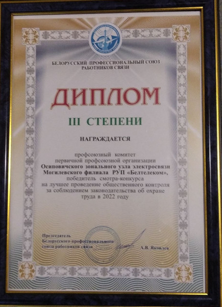 В первый день курсов были награждены победители смотров-конкурсов по охране труда среди структур Белорусского профессионального союза работников связи. Дипломом III степени вручен профсоюзному комитету первичной профсоюзной организации Осиповичского зонального узла электросвязи Могилёвского филиала "Белтелеком". Номинация - за лучшее проведение общественного контроля за соблюдением законодательства об охране труда в 2022 году. Награду вручил председатель Белорусского профессионального союза работников связи Александр Яковлев.