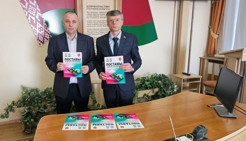 На фото: председатель Поставского районного Совета депутатов Юрий Киселёв и Константин Кукель, ведущий инженер станционной группы Поставского участка электросвязи.