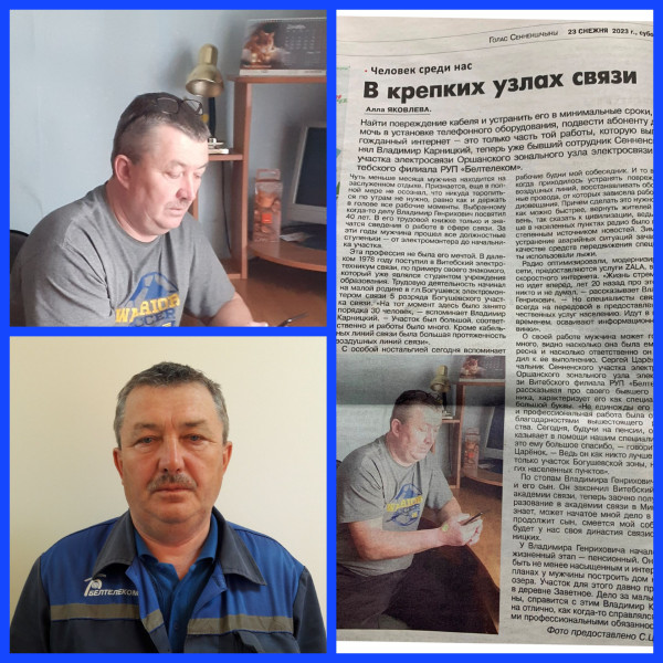Найти повреждение кабеля и устранить в минимальные сроки, помочь в установке оборудования, подвести абоненту интернет– это только часть той работы, которой занимался Владимир Карницкий, сотрудник Сенненского участка электросвязи Оршанского зонального узла электросвязи Витебского филиала РУП «Белтелеком», ныне на пенсии.