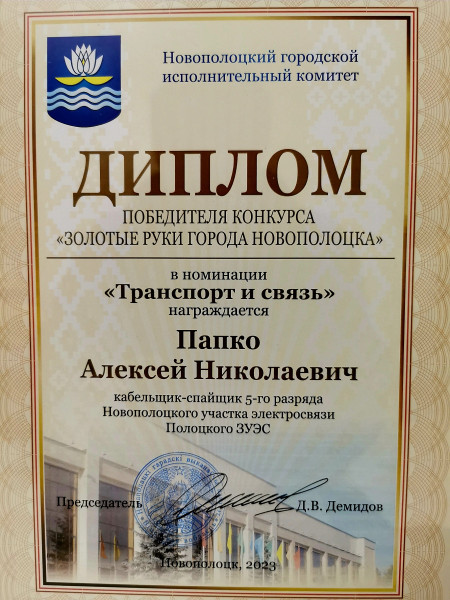 Кабельщик-спайщик 5 разряда Новополоцкого УЭ Полоцкого ЗУЭС ВФ РУП «Белтелеком» Алексей Папко стал победителем ежегодного конкурса «Золотые руки города Новополоцка»в номинации «Транспорт и связь».