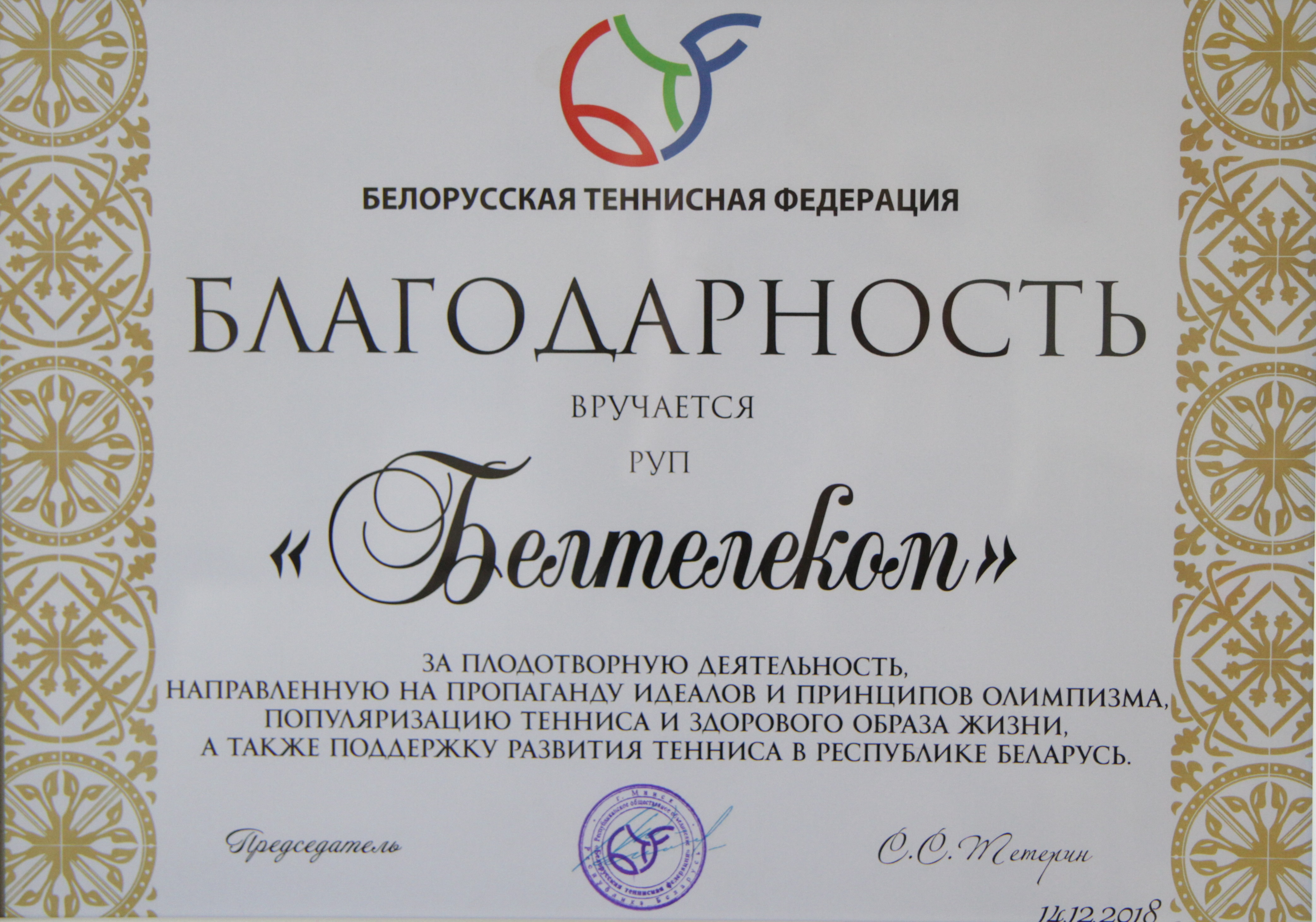 Слова благодарности от Белорусской теннисной федерации прозвучали в адрес организаций, без непосредственного участия которых развитие и популяризация тенниса в Республике Беларусь была бы невозможна. В их числе – РУП «Белтелеком». Наша компания отмечена благодарностью Белорусской теннисной федерации за плодотворную деятельность, направленную на пропаганду идеалов и принципов олимпизма, популяризацию тенниса и здорового образа жизни, а также поддержку развития тенниса в Республике Беларусь.