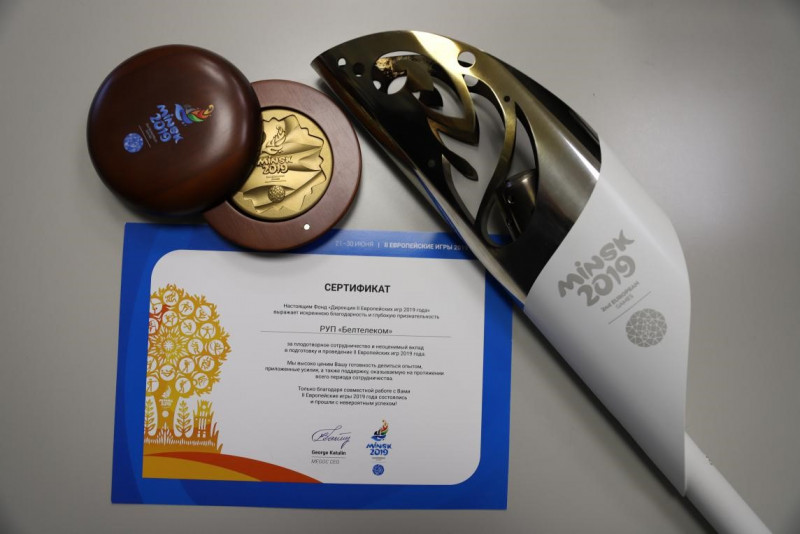 Компания «Белтелеком» выступила Национальным партнером соревнований. Александр Яцко, заместитель директора фонда «Дирекция II Европейских игр 2019 года», и Максим Кошкалда, начальник управления по маркетингу, коммерческим вопросам и рекламе фонда «Дирекция II Европейских игр 2019 года», поблагодарили руководство и коллектив РУП «Белтелеком» за совместную работу и отметили неоценимый вклад связистов в подготовку и проведение II Европейских игр 2019 года. Они также вручили руководству компании символы Игр – факел, принимавший участие в эстафете «Пламя мира», и памятную медаль, аналогичную тем, что получали победители соревнований.