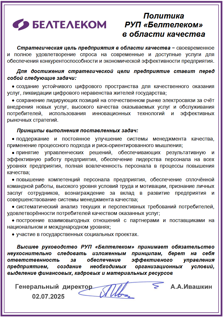 Политика РУП «Белтелеком» в области качества