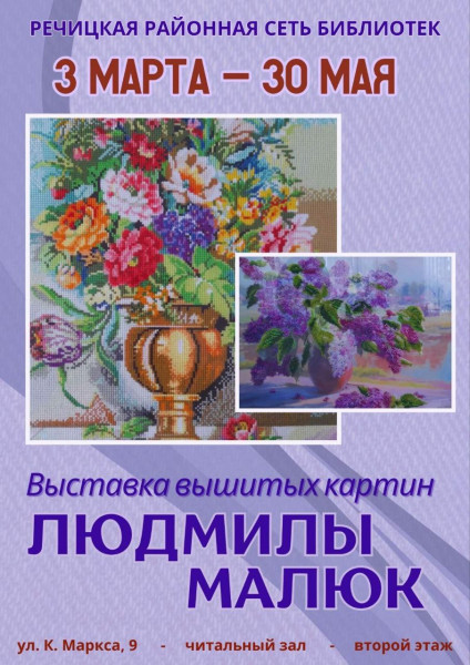 Ветераны Речицкого ЗУЭС Гомельского филиала РУП "Белтелеком" посетили выставку вышитых работ Людмилы Сергеевны Малюк, бывшего председателя первичной профсоюзной организации Речицкого ЗУЭС. Людмила Сергеевна увлекается вышивкой более 10 лет, создав около 100 картин, среди которых натюрморты, пейзажи и иконы.