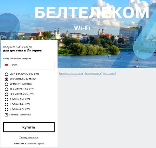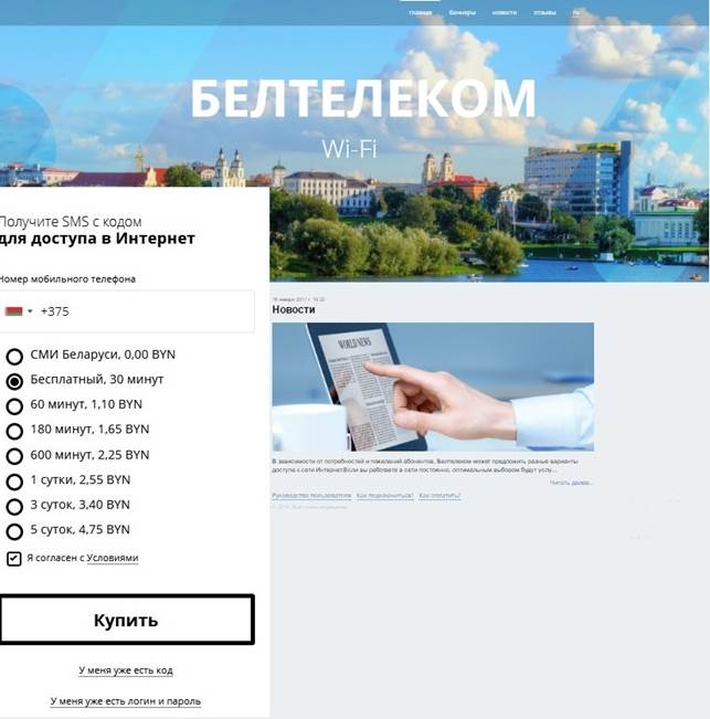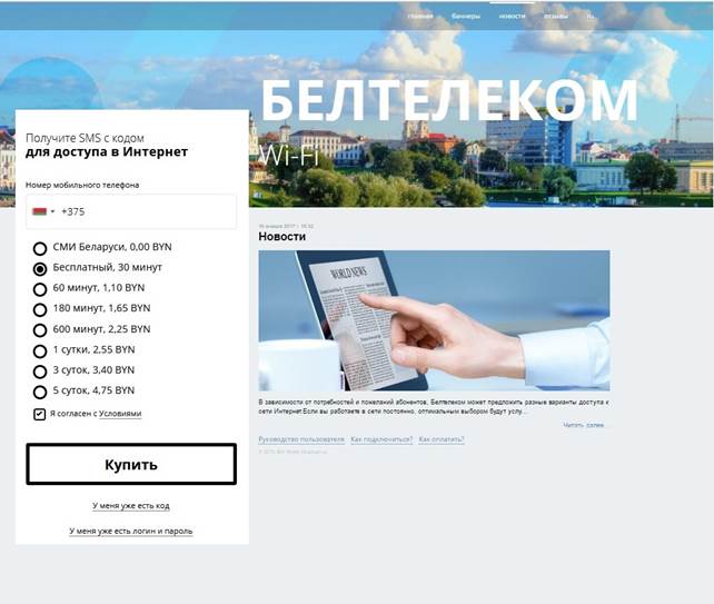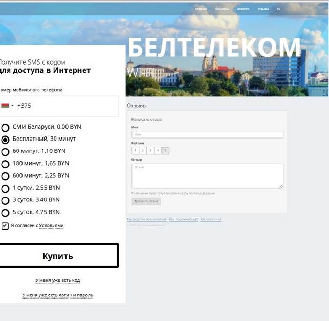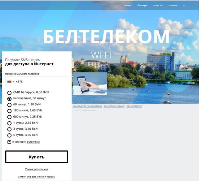 Пры падключэнні да сеткі Wi-Fi і пасля ўводу адраса http://ciscowifi.beltelecom.by або любога іншага адраса ў адрасны радок браўзэра адкрыецца галоўная старонка партала аўтарызацыі сеткі Wi-Fi на рускай мове (Малюнак 1).