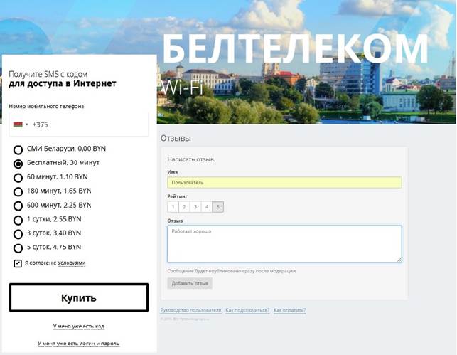Партал аўтарызацыі сеткі Wi-Fi даступны карыстальнікам па адрасе: http:// wifi.beltelecom.by.