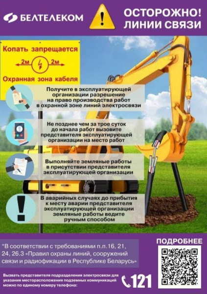 Адзіны нумар для ўдакладнення працэдуры атрымання пісьмовага дазволу на права вытворчасці работ, для выкліку прадстаўніка падраздзялення электрасувязі для ўказанні месца размяшчэння падземных камунікацый - 121. Асобы, якія парушылі правілы аховы ліній сувязі, прыцягваюцца да адказнасці па артыкуле 23.2 Кодэкса Рэспублікі Беларусь аб адміністрацыйных правапарушэннях і па артыкуле 372 Крымінальнага кодэкса Рэспублікі Беларусь.