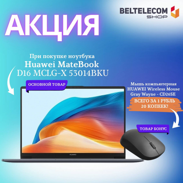 Покупайте ноутбук Huawei MateBook D16 MCLG-X 53014BKU и получите возможность приобрести компьютерную мышь HUAWEI Wireless Mouse Gray Wayne - CD26SE всего за 1 рубль 20 копеек!
