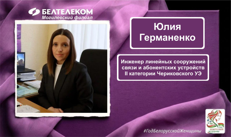 В Год белорусской женщины мы будем рассказывать про замечательных и прекрасных сотрудниц Могилевского филиала "Белтелеком". Они вносят достойный вклад в развитие компании. Сегодня мы познакомим вас с Юлией Германенко - инженером линейных сооружений связи и абонентских устройств II категории Чериковского УЭ.