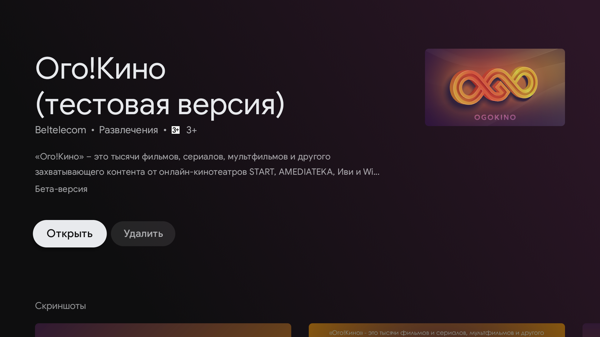 Установка приложения через Google Play.Запускаем приложение Google Play, в строке поиска вводим “Ого!Кино” [1].В результатах поиска выбираем приложение “Ого!Кино”, нажимаем на пульте дистанционного управления кнопку “Ок”. Просматриваем информацию о приложении, производим установку приложения, нажав на кнопку “Установить”.После успешной установки приложения появится кнопка “Открыть”.Авторизация абонента в приложенииДля авторизации в приложении “Ого!Кино” требуется ввести “Логин” и “Пароль” на странице авторизации приложения. [2]Описание приложенияКонтент приложения “Ого!Кино” включает в себя художественные и документальные фильмы, сериалы, детский контент и прочие видеоматериалы онлайн-кинотеатров Иви, Амедиатека, START и Wink. Количество и перечень онлайн-кинотеатров, входящих в состав приложения, может изменяться.После запуска приложения абоненту доступен контент на “Главной странице”, странице “Фильмы”, странице “Сериалы”, странице “Детям”.Перемещаясь по разделам приложения “Ого!Кино”, абонент осуществляет фильтрацию контента “Фильмы”, “Сериалы” и т.д.Для упрощения поиска необходимого контента, доступен выбор определенного жанра.На странице “Детям” отображается контент с возрастным ограничением 12+, в случае, если не задано дополнительное ограничение в настройках родительского контроля.Родительский контрольФункционал “Родительский контроль” реализует ограничения отображения и доступа к контенту, согласно настройке возрастного рейтинга, выставляемого пользователем. Пароль по умолчанию “0000”.Для изменения возрастного ограничения необходимо перейти в “Профиль” - “Родительский контроль”, включить функционал, переместить “ползунок” на необходимый возраст, сохранить настройку.Приложение “Ого!Кино” имеет простой и понятный интерфейс управления. Специалисты служб технической поддержки окажут необходимую помощь и консультацию в случае возникновения трудностей.Информация для службы технической и консультационной поддержки 123 находится в разделе “Помощь”. [1] Приложение «Ого!Кино» будет доступно в магазине приложений GooglePlay после прохождения тестирования и публикации со стороны Google. На приставках РУП «Белтелеком» DV 9135 приложение будет установлено через систему управления РУП «Белтелеком»[2] Услугу можно подключить в «Кабинете пользователя», приложении «Мой Белтелеком» или в офисах продаж Печать